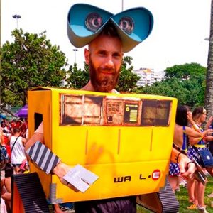Com uma simples caixa de papelão você pode se transformar no robôzinho Wall-e! Para dar vida à esse robô super fofo, utilize uma caixa de papelão grande com o fundo aberto e faça furos para a cabeça e braços. Pinte e imprima os detalhes da lataria com imagens da internet. A cabeça é feita de papel couro e os olhos também são uma impressão colada em papelão, assim como as rodas. No exemplo da foto, o melhor detalhe é o revestimento: reaproveitamento de tapetinho de yoga! Super sustentável! ?