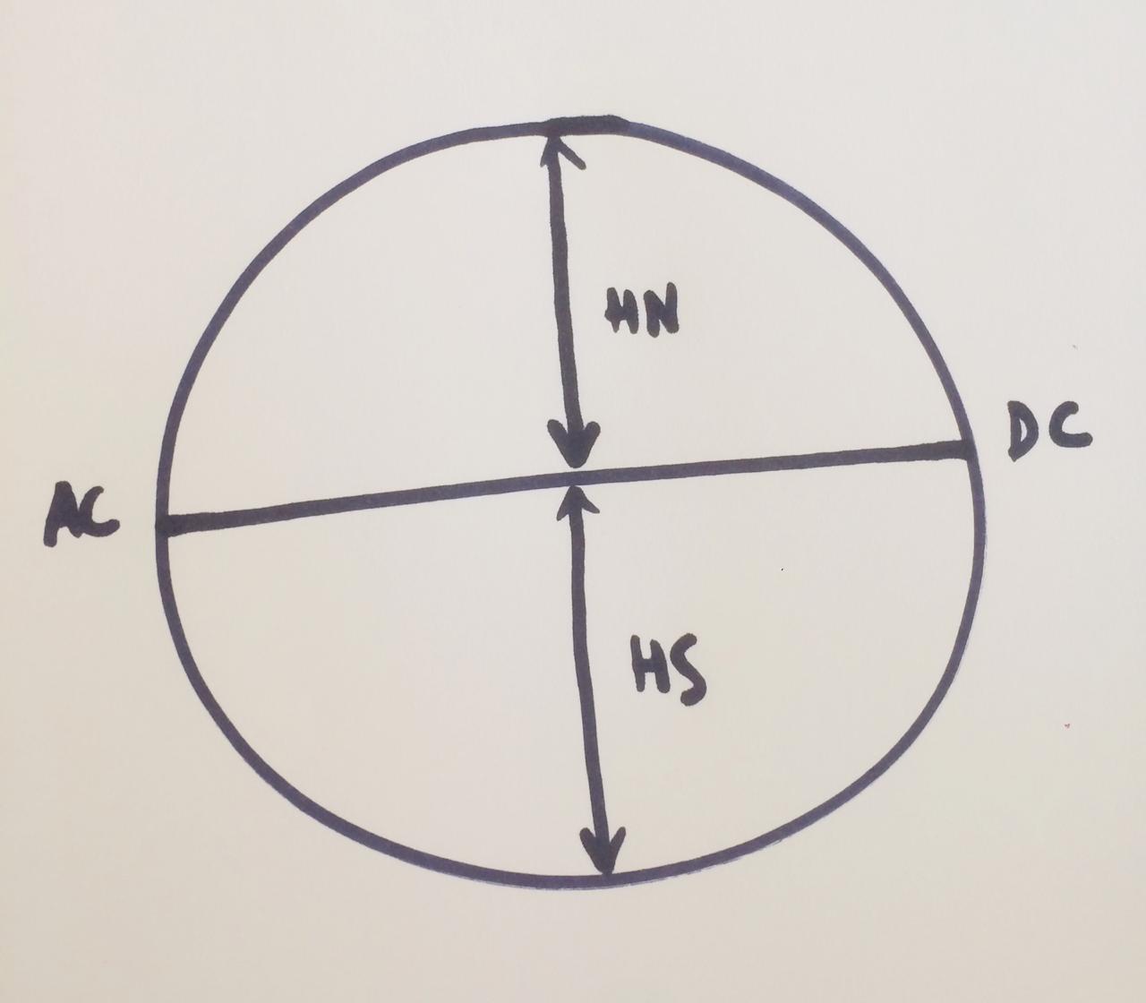 Perceba que quando chegamos ao descendente, traçamos uma linha horizontal em nosso mapa, conectando o ascendente ao descendente.